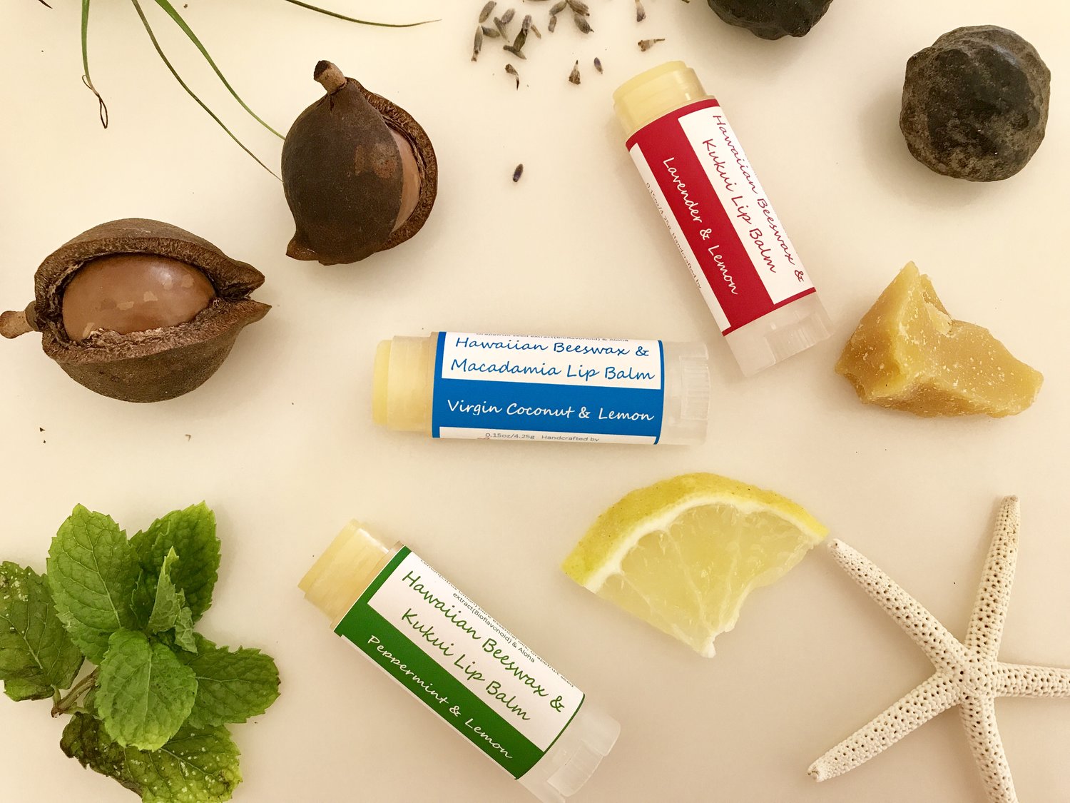 Hawaiian Beeswax, Olive oil, Castor oil, Jojoba oil, Coconut oil, Aloe, vitamin E, Grapefruit Seed Extract, Aloha, Pure therapy grade essential oils, Kukui Nut or Macadamia oil, coco butter (in some variety), and Aloha