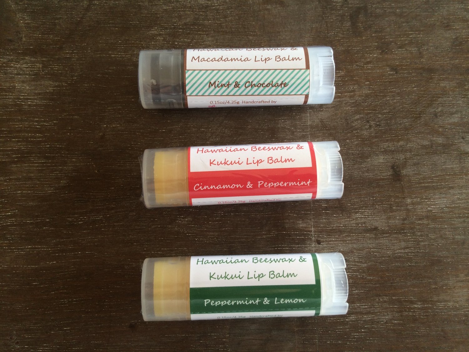 Made with Beeswax from the local honey company. All Natural made only with edible essential oils. Blend of oils provide unique healing property, including Hawaiian Kukui and/or Macadamia nut oils. Choose your 3 favorite scents at the time of order.