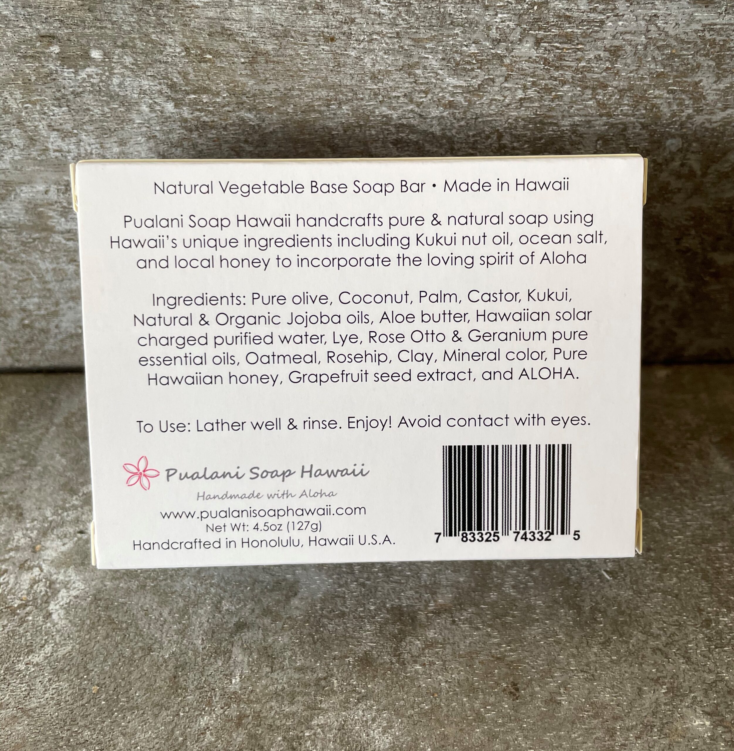 Pure olive oil, Coconut oil, Palm oil, Castor oil, Aloe butter, Hawaiian Kukui Nut oil, Organic and Natural jojoba oil, Hawaiian solar charged purified water, Lye, Rose otto and Geranium pure essential oils, Clay, Mineral color, Ground Rosehip, Ground oatmeal, Pure Hawaiian honey, Grapefruit seed extract, and Aloha