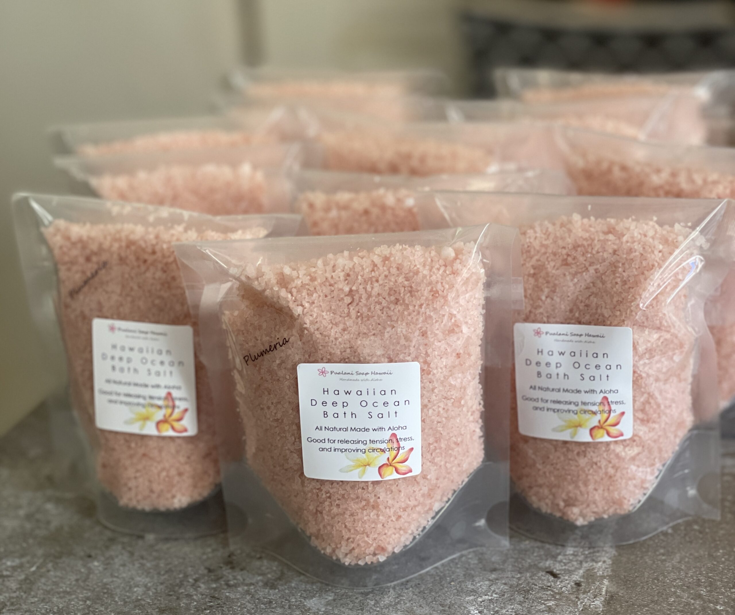 ハワイアンソルト、エプソム塩、ハワイアンディープオーシャン・ソルト、重曹、クエン酸、ククイナッツ油、ホホバ油、クレイ、純正アロマ油(精油)