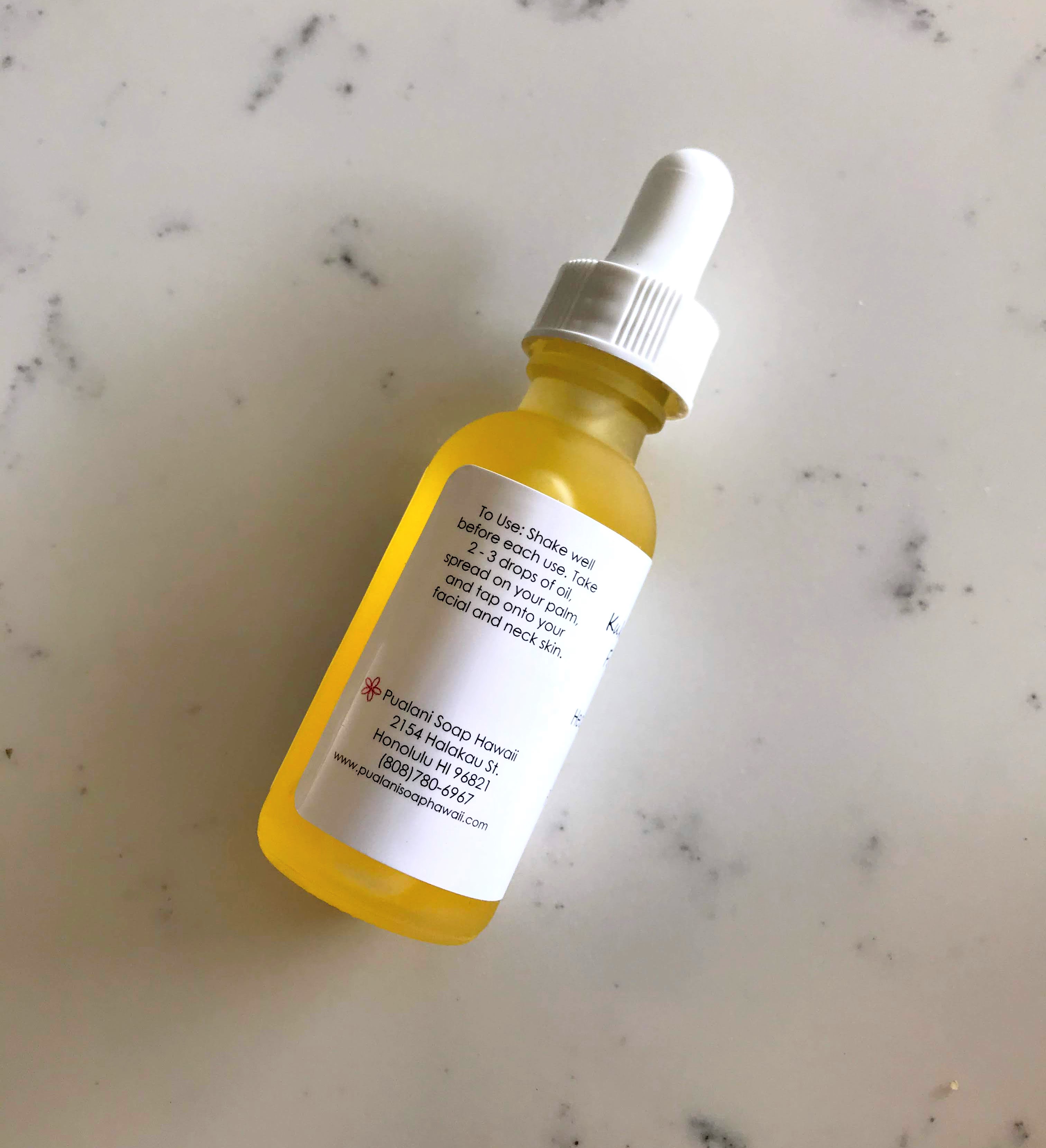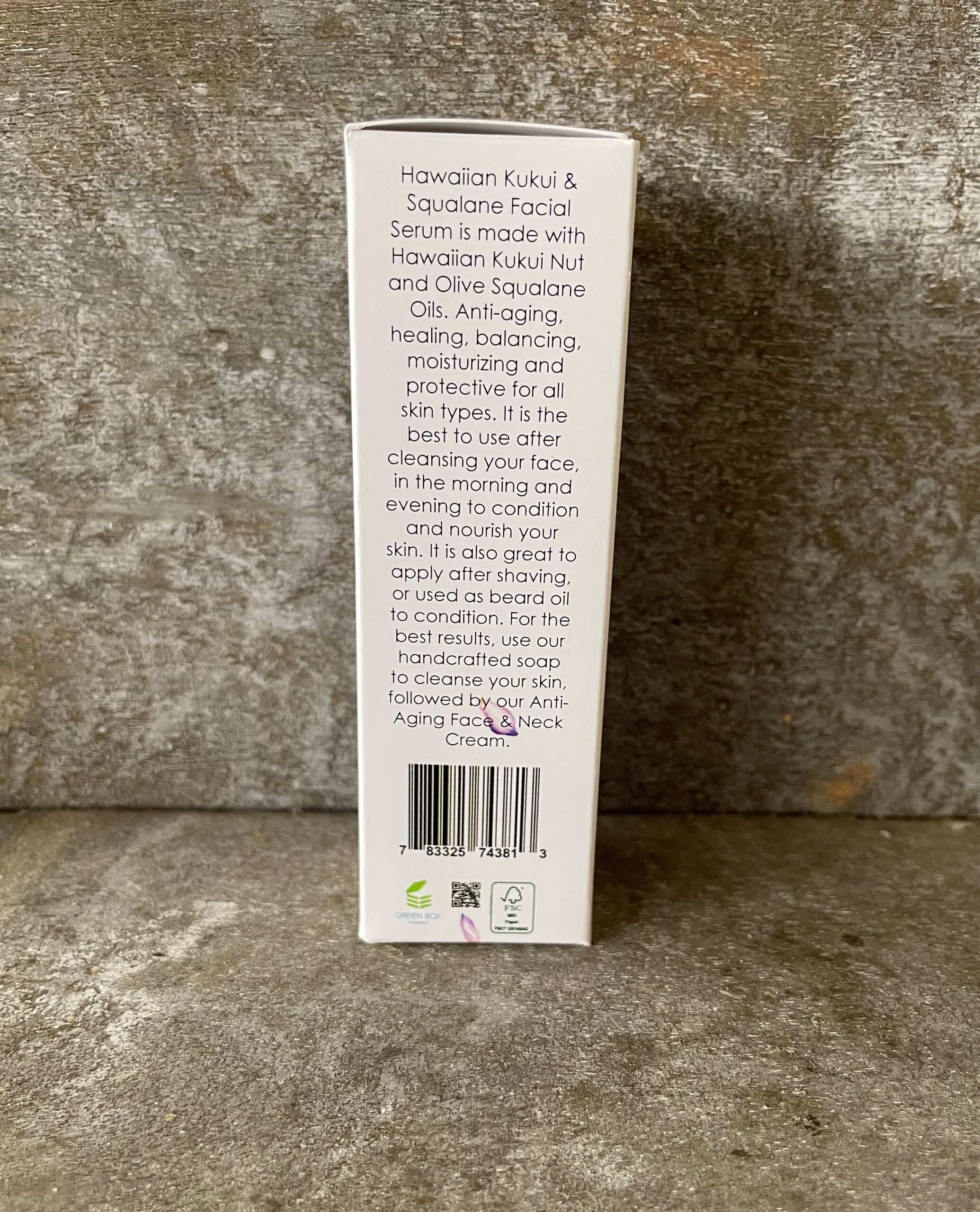 Made with Hawaiian Kukui Nut and Olive Squalane Oils. Anti-aging, healing, balancing and protective for all skin types.  It is the best to use after cleansing your face, in the morning and evening to condition and nourish your skin. It is also great to apply after shaving, or used as beard oil to condition.  For the best results, use our handcrafted soap to cleanse your skin, followed by our Anti-Aging Face & Neck Cream.