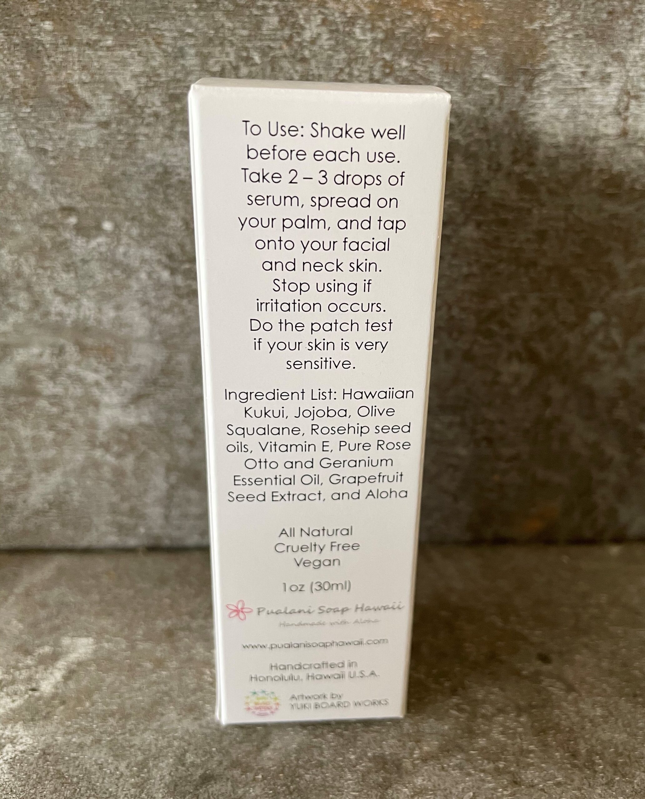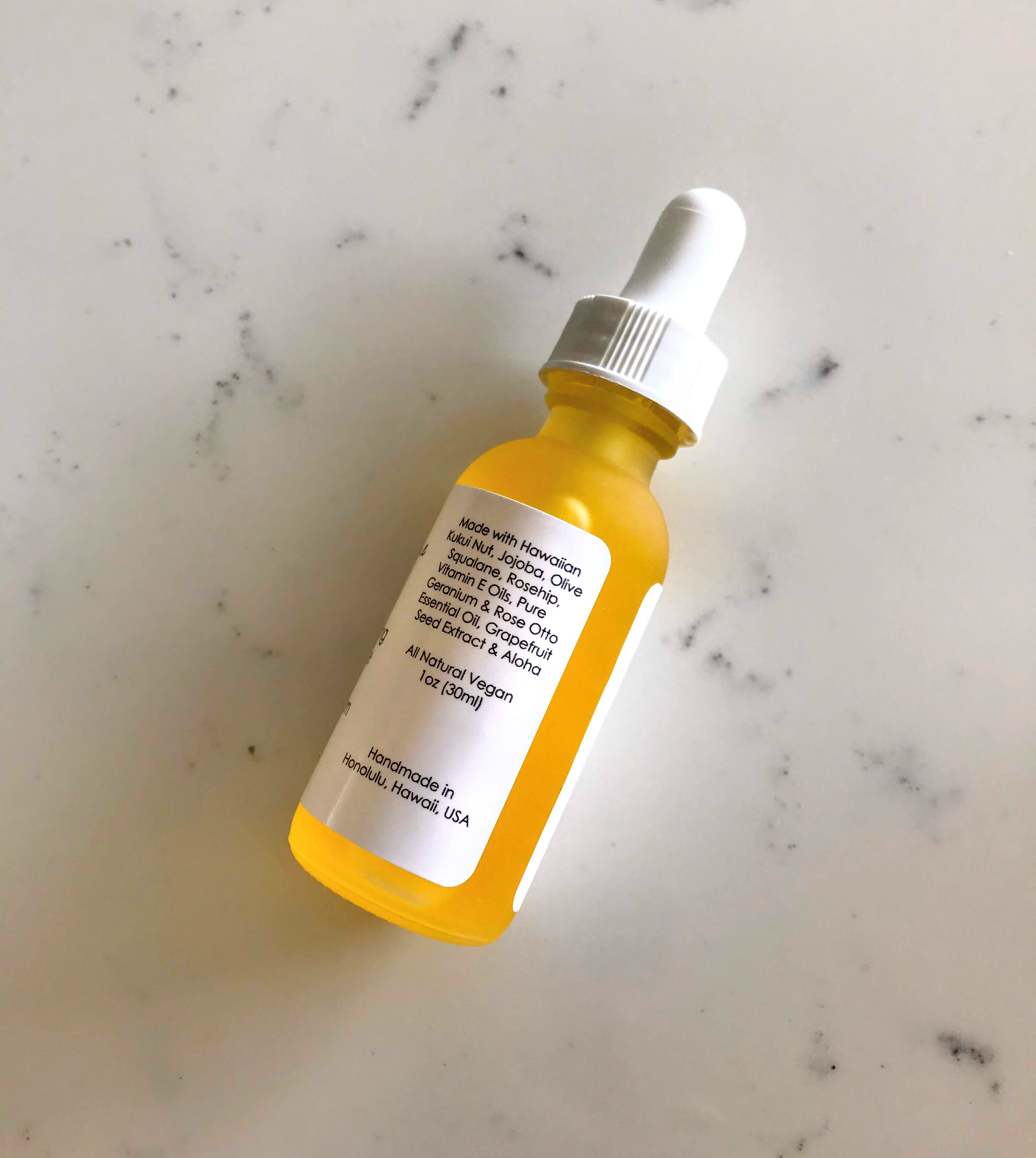 Ingredient List: Hawaiian Kukui, Jojoba, Olive Squalane, Rosehip seed oils, Vitamin E, Pure Geranium Essential Oil, Grapefruit Seed Extract, and Aloha