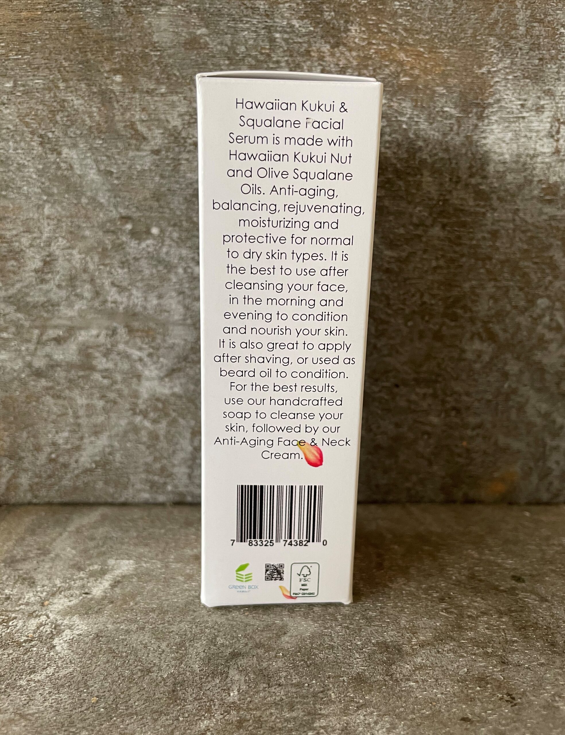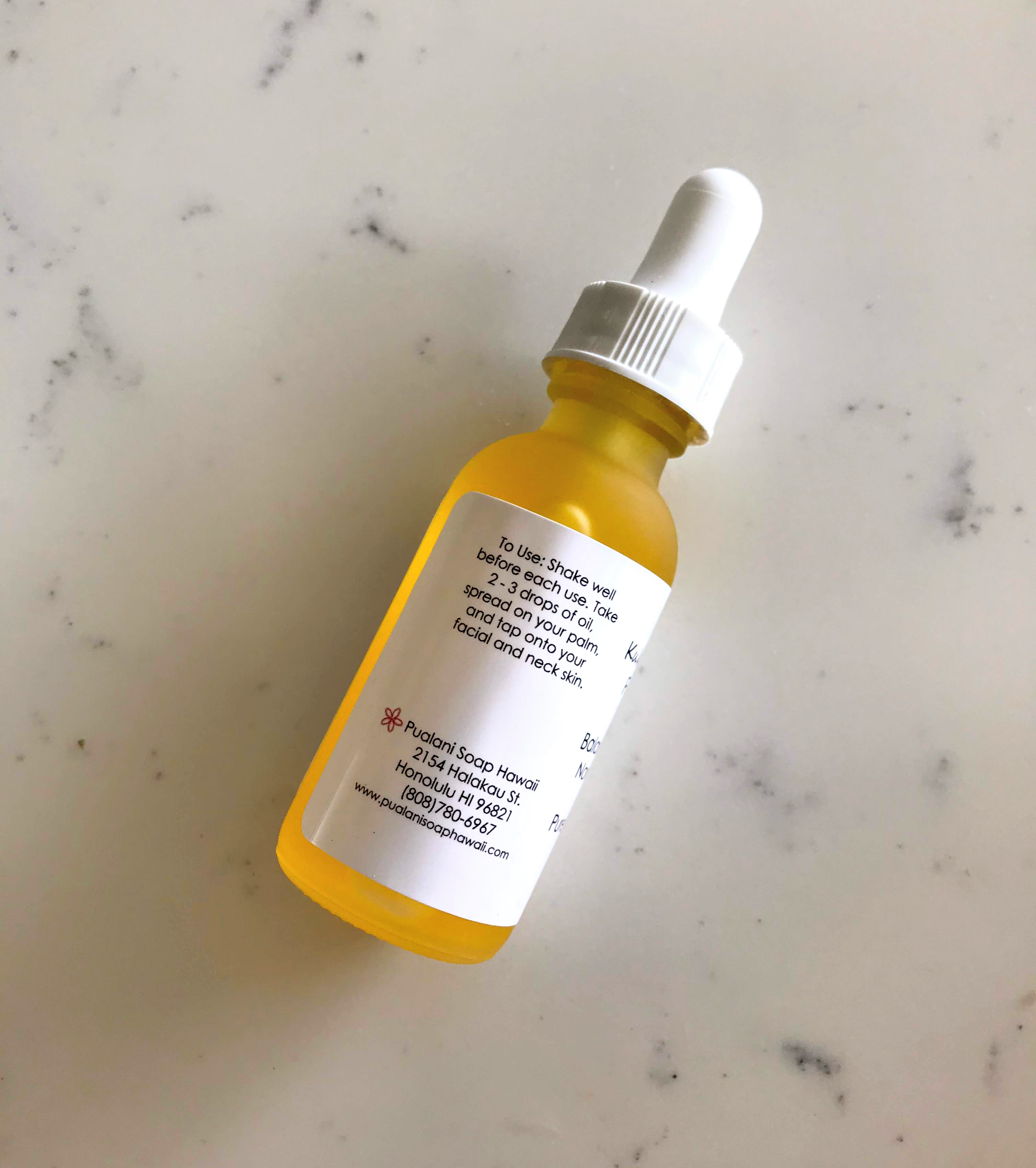 Made with Hawaiian Kukui Nut and Olive Squalane Oils. Anti-aging, balancing, rejuvenating, moisturizing and protective for normal to dry skin type. It is the best to use after cleansing your face, in the morning and evening to condition and nourish your skin. It is also great to apply after shaving, or used as beard oil to condition.  For the best results, use our handcrafted soap to cleanse your skin, followed by our Anti-Aging Face & Neck Cream.