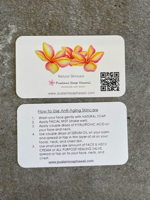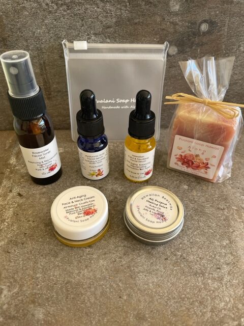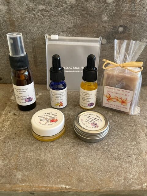 Rosewater Mist or Lavender Water Mist, Hyaluronic Acid, Hawaiian Kukui & Squalane Facial Serum, Anti-Aging Face & Neck Cream, All Purpose Healing Salve, Mini Soap, Soap Pouch