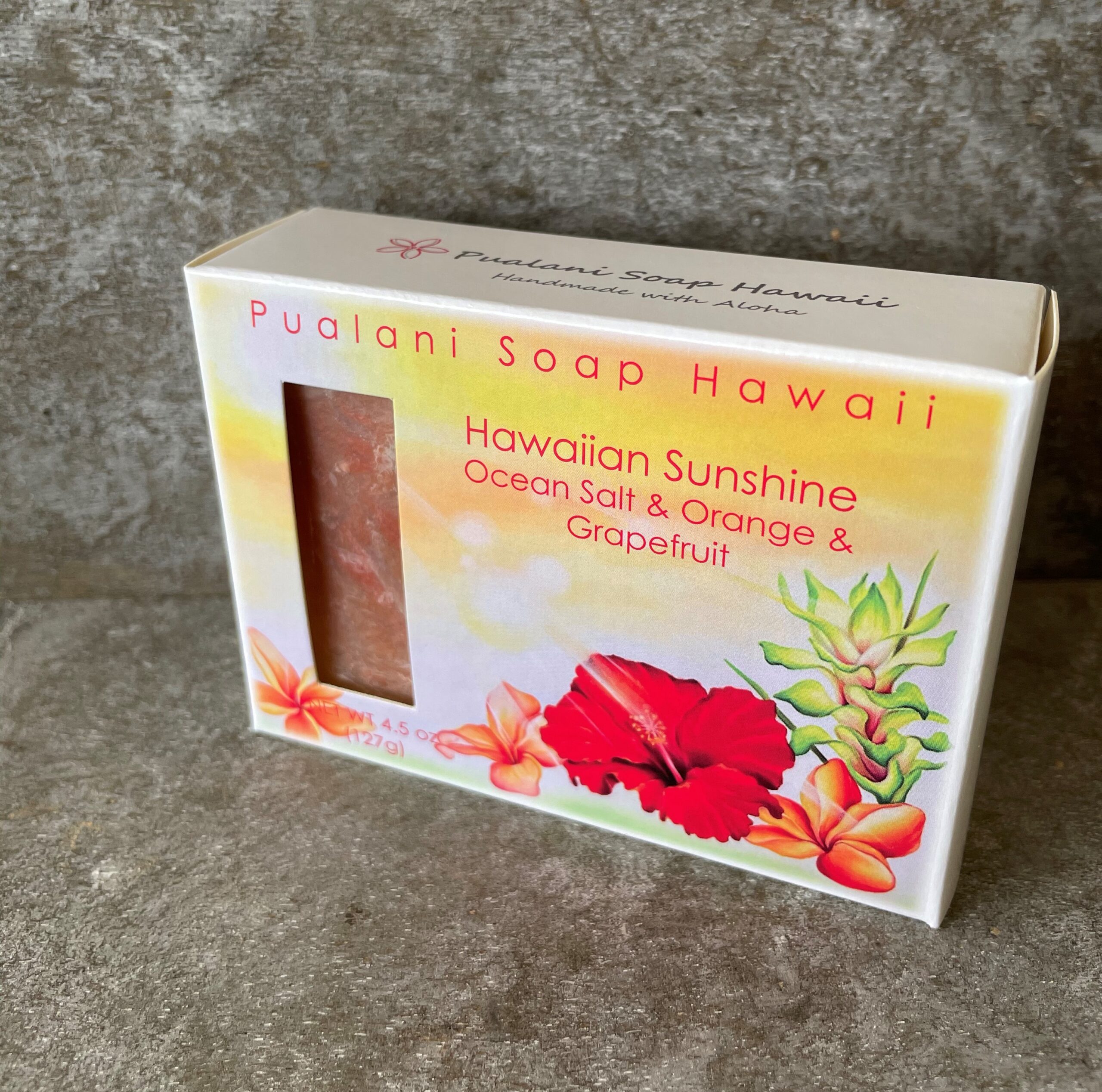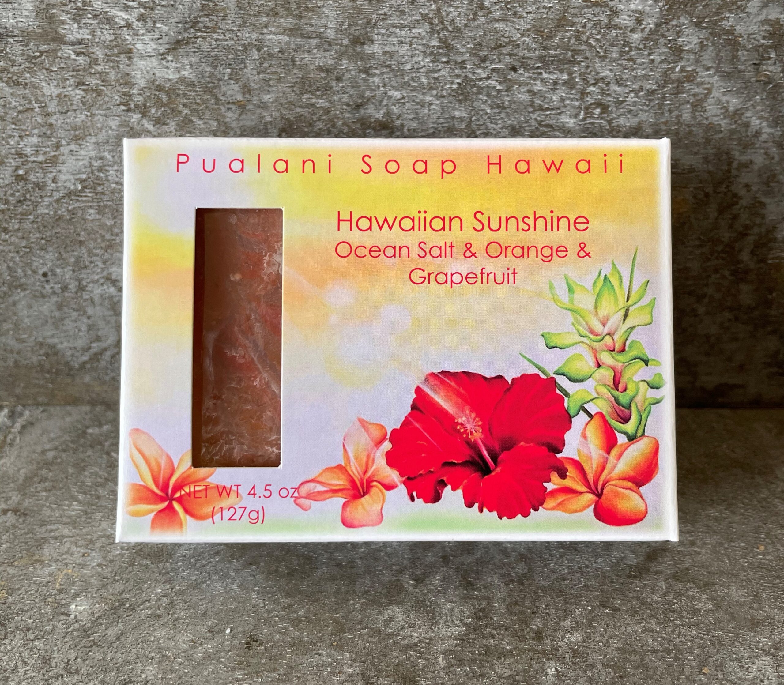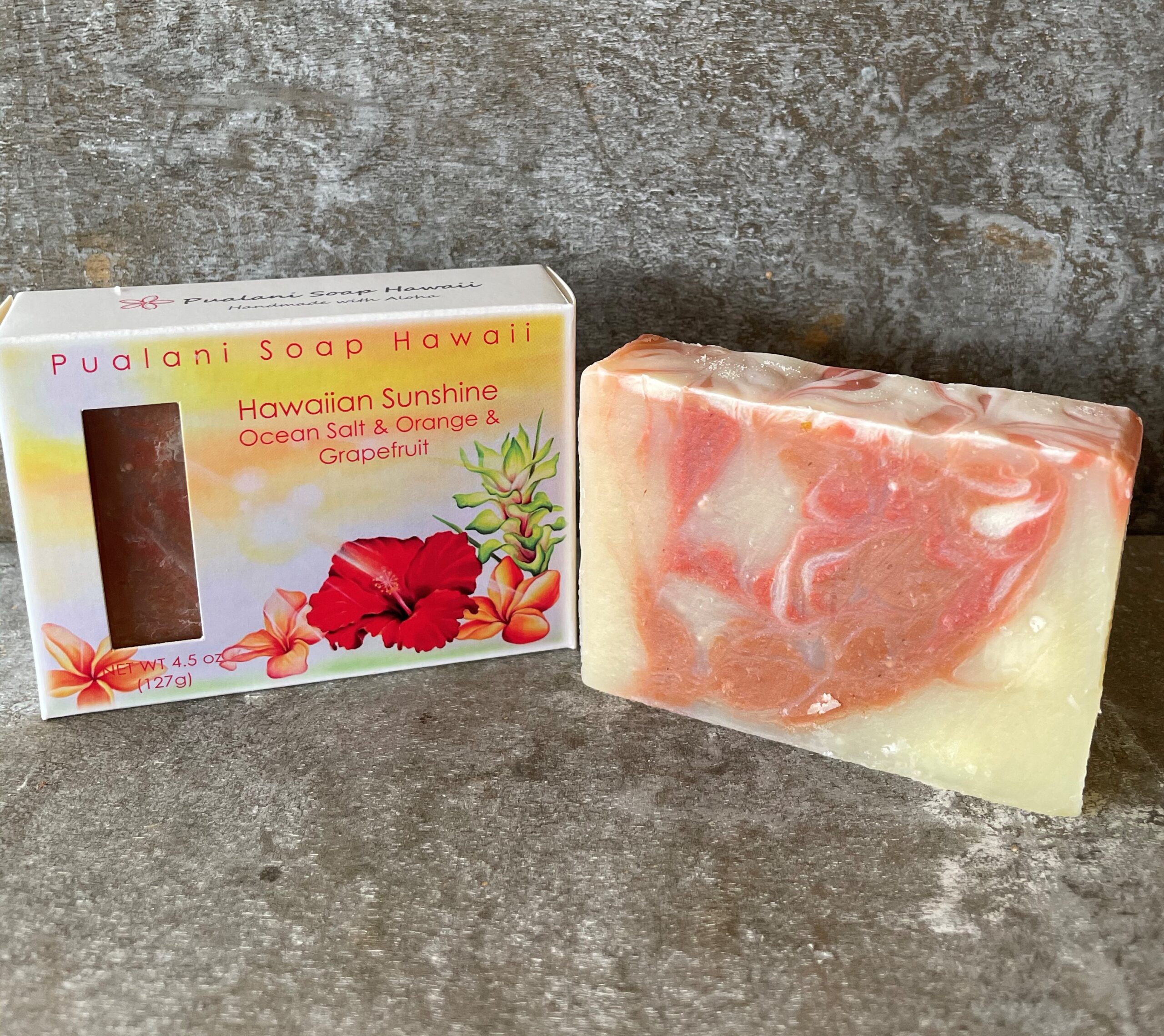 Pure olive oil, Coconut oil, Palm oil, Castor oil, Hawaiian Kukui Nut oil, Organic and natural jojoba oil, Aloe butter, Hawaiian solar charged purified water, Lye, Kona deep ocean salt, Pure Sweet Orange and Pink Grapefruit essential oils, Hawaiian honey, Grapefruit seed extract, Moroccan clay, Mineral color, and Aloha