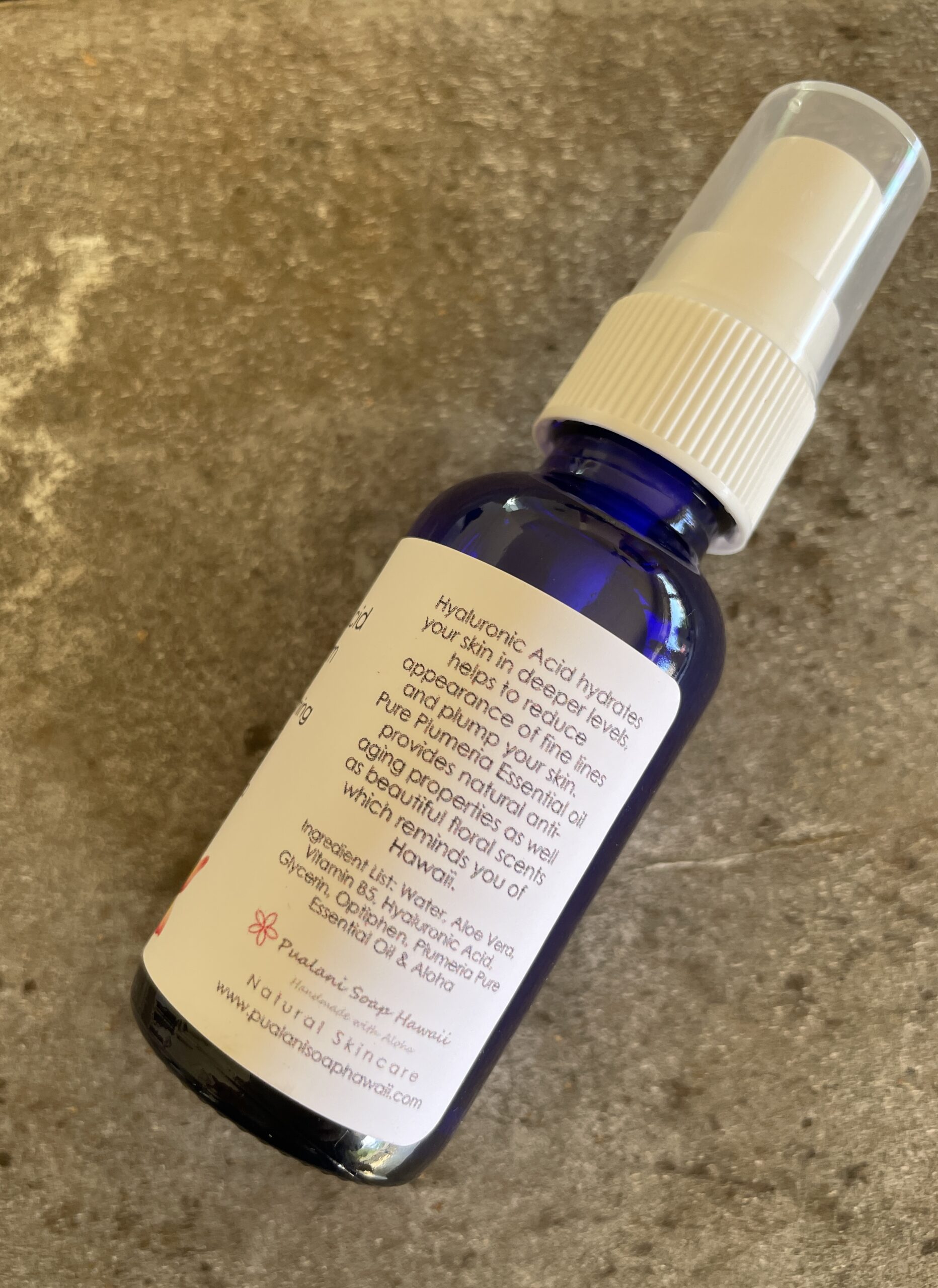Hyaluronic Acid hydrates your skin in deeper levels, helps to reduce appearance of fine lines and plump your skin. Pure Plumeria Essential oil provides natural anti-aging properties as well as beautiful floral scents which reminds you of Hawaii. All Natural, Cruelty Free, and Vegan.