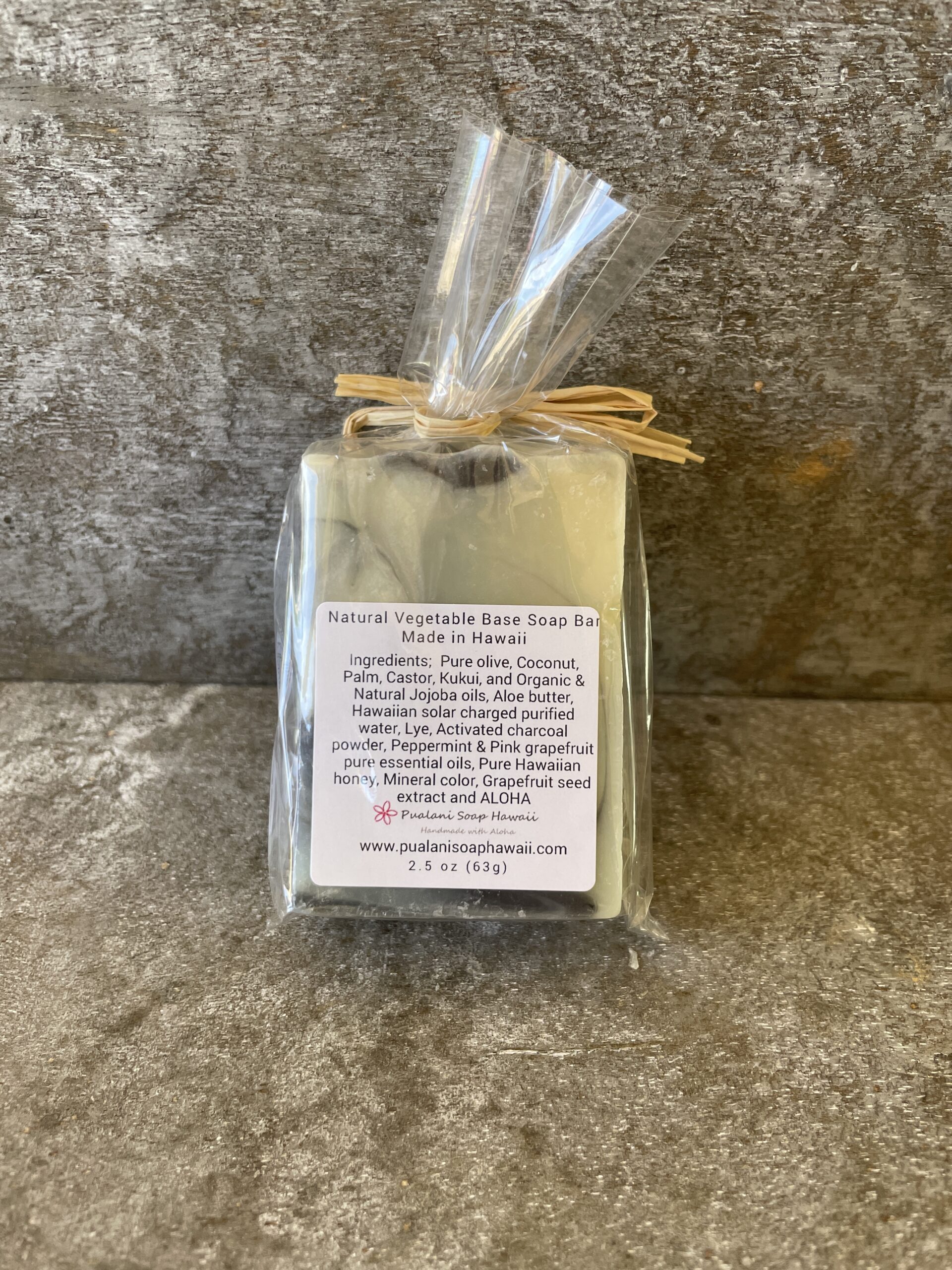 Pure olive oil, Coconut oil, Palm oil, Caster oil, Hawaiian Kukui nut oil, Organic jojoba oil, Aloe butter, Hawaiian solar charged purified water, Lye, peppermint and pink grapefruit pure essential oils, Pure Hawaiian honey, Activated charcoal powder, Mineral color, Grapefruit seed extract, and Aloha