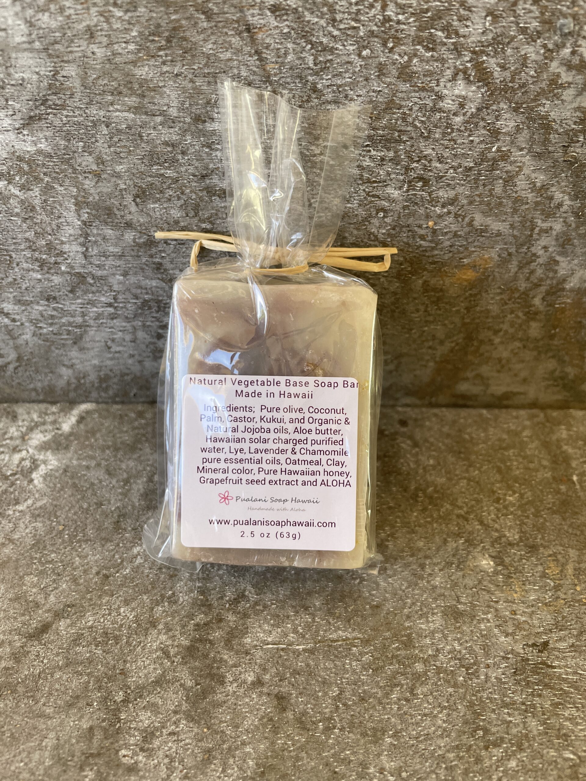 Ingredient List: Pure olive oil, Coconut oil, Palm oil, Castor oil, Aloe butter, Hawaiian Kukui Nut oil, Organic jojoba oil, Hawaiian solar charged purified water, Lye, Lavender & Chamomile pure essential oils, Ground oatmeal, Clay, Pure Hawaiian honey, Grapefruit seed extract, and Aloha