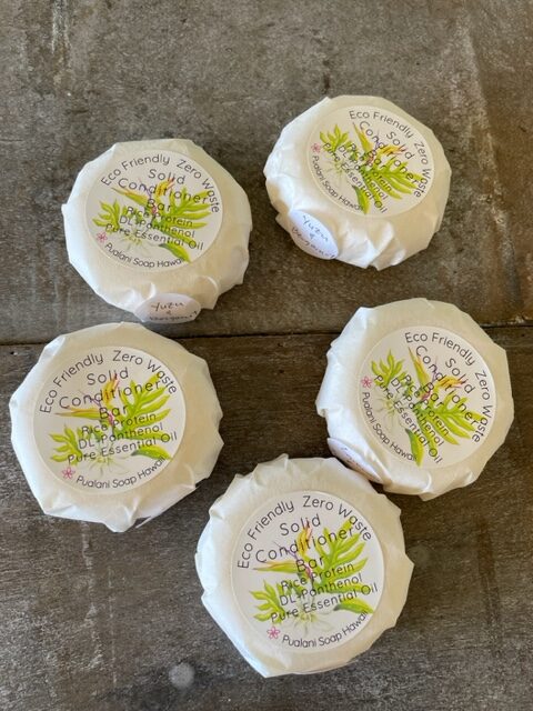 Solid Conditioner Bar is Eco Friendly and zero waste. Each conditioning bar is packaged with parchment and tissue papers. The conditioner bar is made with natural materials derived from RSPO Palm oil (sustainable source). This conditioning bar helps to reduce frizz, softening and emollient to hair. Hawaiian Kukui Nut oil, jojoba oil, cocoa butter, and shea butter nourishes and condition hair. Hydrolyzed rice protein strengthen hair and aid hair growth. DL-Panthenol (vitamin B5) repair damaged hair. It is scented with Pure essential oils and colored with natural clay and mineral mica colors.