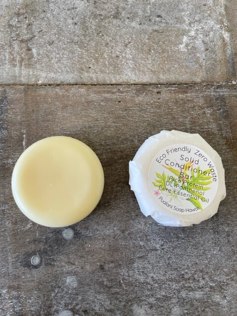 Solid Conditioner Bar. Eco Friendly and zero waste. Each conditioning bar is packaged with parchment and tissue papers. The conditioner bar is made with natural materials derived from RSPO Palm oil (sustainable source). This conditioning bar helps to reduce frizz, softening and emollient to hair. Hawaiian Kukui Nut oil, jojoba oil, cocoa butter, and shea butter nourishes and condition hair. Hydrolyzed rice protein strengthen hair and aid hair growth. DL-Panthenol (vitamin B5) repair damaged hair. It is scented with Pure essential oils and colored with natural clay and mineral mica colors.
